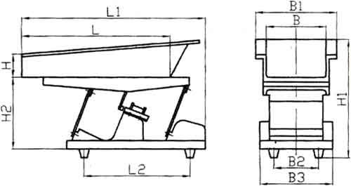 ??電磁振動給料機的振幅和給料量受料倉倉壓影響較大,設計料倉時應盡量減少倉壓,使溜咀后側板承受一定的倉壓,并設置斜溜沮及下料閘門。如圖,一般a=1/4b。溜咀四周應與給料槽留有一定的間隙,一般5~10mm,以免產生噪音及影響振動。