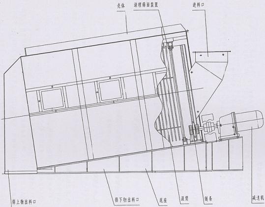 ??拋料式自清掃滾筒篩由殼體、篩筒、篩筒支架、減速機、減速機座幾部分組成。機械傳動由電動機經減速機后,傳給齒輪,通過齒輪傳動使篩筒旋轉。PQG型拋料式自清掃滾筒篩的主體結構是篩分筒,整體與地平面呈傾斜狀態,外部被密封隔離罩所密封,以防止污染環境。通過變速減速系統使篩分筒在一定轉速下進行旋轉,燃煤自上而下通過篩分筒得到分離,細料從篩分筒前端下部排出,粗料從篩分筒下端尾部。